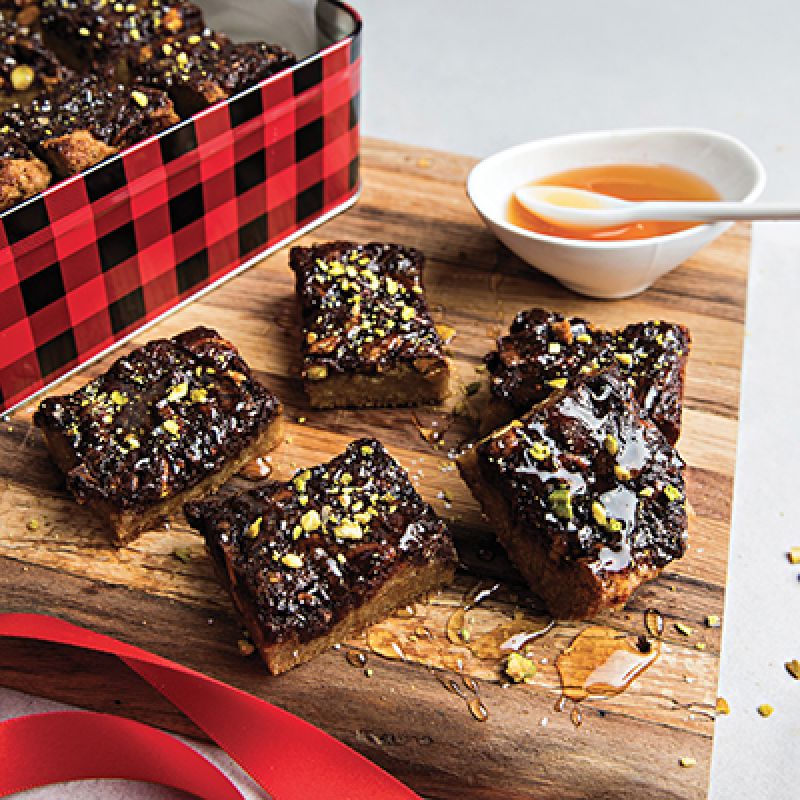 Bake for 10 minutes, rotate the tray 180 degrees, and bake for an additional 10 minutes. Remove from oven and let cool completely before cutting. Cut into 12 two-inch bars or 24 bite-size bars. Store in an airtight container for up to one week.