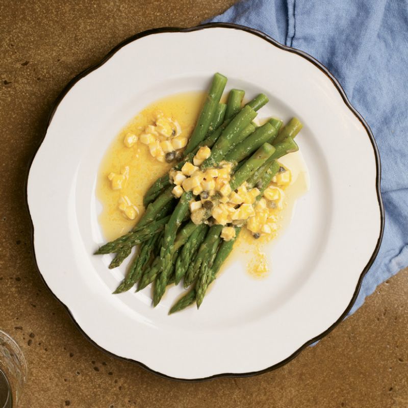 Bring a pot of salted water to a low boil over medium-high heat. Prepare an ice bath by filling a large bowl with equal parts ice and water. Cook the asparagus until tender, five to seven minutes. Remove them from the boiling water and plunge into the ice bath. Once cooled, remove, pat dry, and set aside. Reserve the ice bath for the gribiche.