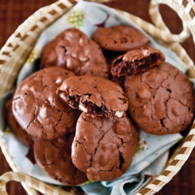 In a separate bowl, sift together flour, baking powder, and salt. In another mixing bowl, beat eggs, sugar, and vanilla until fluffy. Add melted chocolate and then flour mixture. Beat until blended. Stir in chips and nuts.