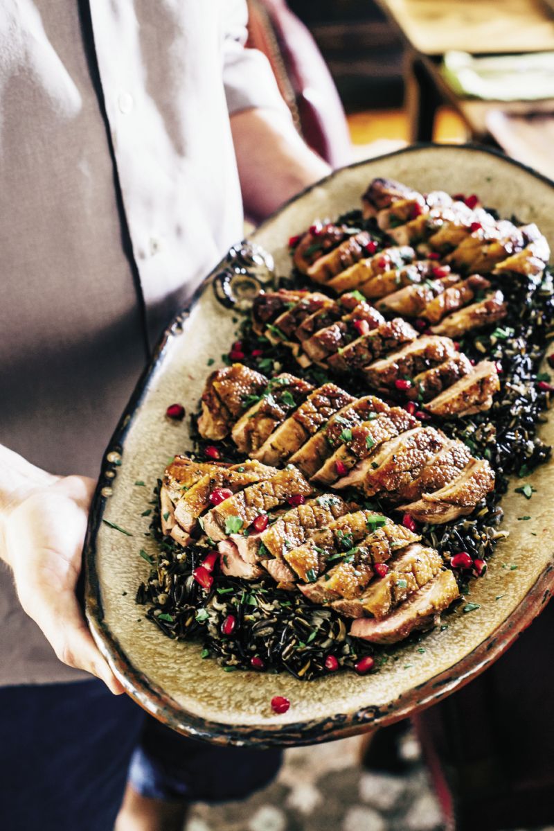Return the sauce to medium-low heat. Add the butter and stir to combine. Cook three to five minutes, or until the sauce coats the back of a spoon. Season to taste with salt and pepper. Slice the duck and place it on top of the rice; drizzle the sauce over all and garnish with the fresh parsley leaves and the pomegranate seeds.