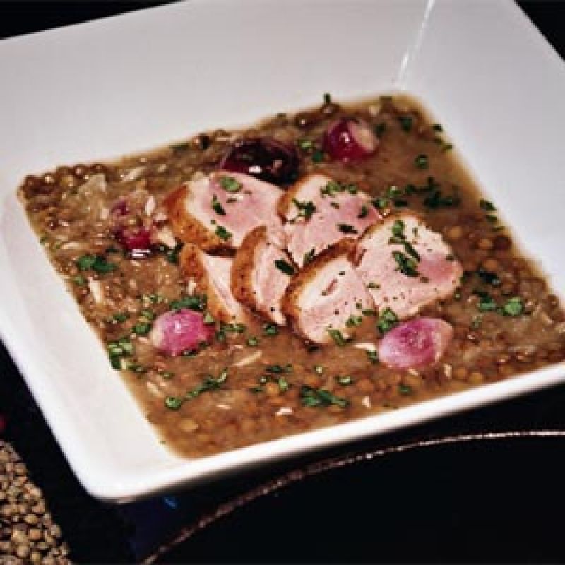 Puree onion, celery, and roasted garlic in food processor. Put puree in heavy-bottomed saucepan and sweat, covered, over medium-low heat until onion is translucent. Deglaze pan with sherry. Add lentils, pearl onions, and stock. Bring to a simmer, cover, and cook on low heat for 25 minutes, or until lentils are tender. Season with salt and pepper.