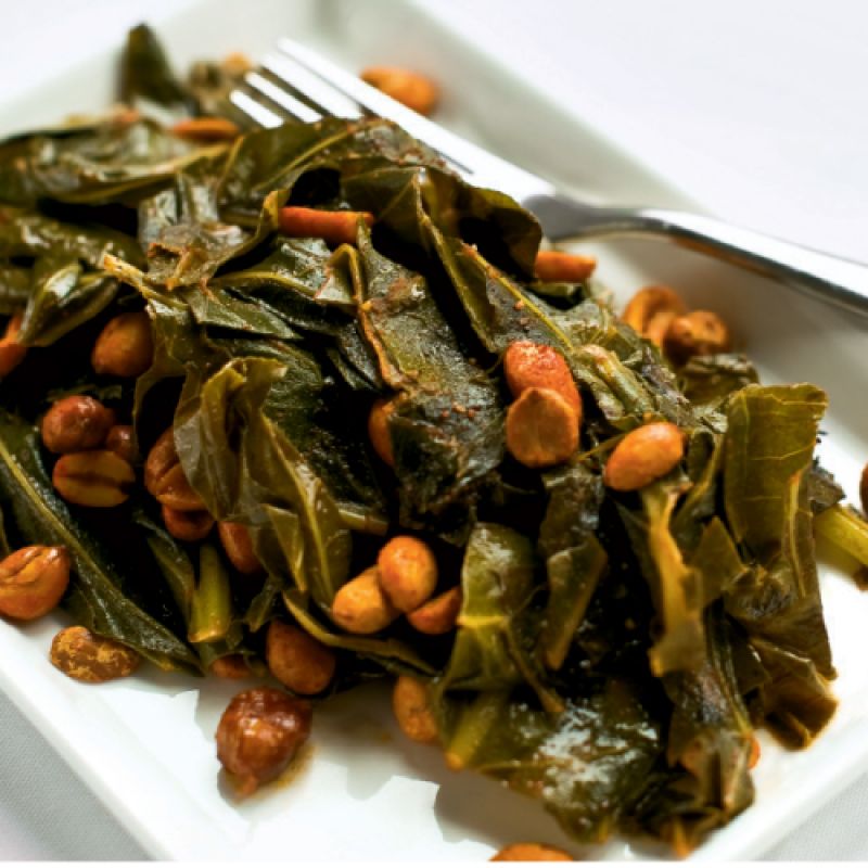 Add the cumin and cook to toast it lightly, about two minutes. Add the saffron and stir quickly. Immediately add the vinegar and chicken stock. Add the collards. Reduce the heat to medium and simmer for 20 minutes, or until the collards are tender and the broth has reduced by three-fourths. Adjust the seasoning with salt and pepper. Fold in the peanuts. Remove from the heat and serve immediately.