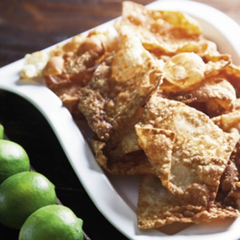 Heat the peanut oil in a two-quart saucepan on stove until oil reaches 350°F. Working in batches so as not to crowd the pan, fry the wonton wrappers for approximately 20 seconds, or until lightly browned. Drain on paper towels. Sprinkle with kosher or sea salt.