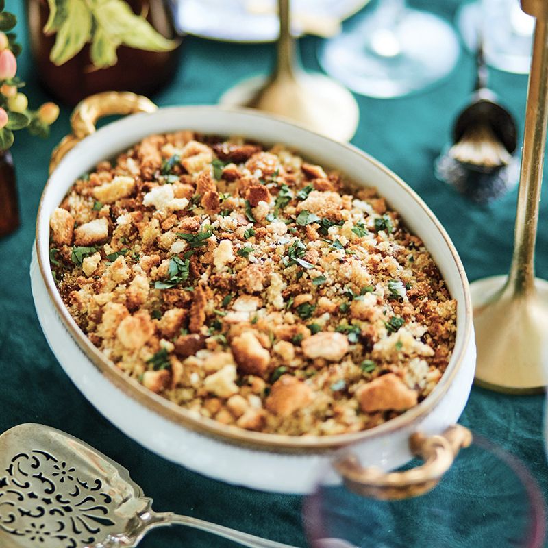 Put the oysters in a strainer over a medium bowl to catch their liquor. Reserve 3/4 cup of the oyster liquor. Combine the crumbled bread and oysters in a large bowl.