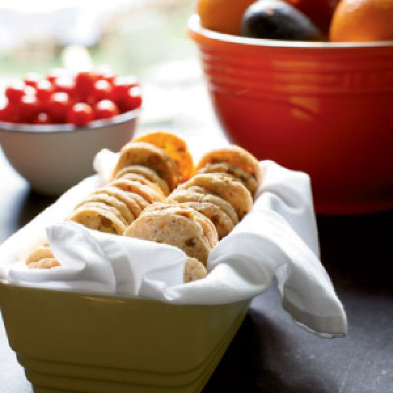 In a medium bowl, combine the butter and the cheese. Beat at medium speed until well-combined. In a separate bowl, combine the flour, salt, and black and cayenne pepper. Add to the cheese mixture and beat on low until blended. Add the nuts and stir until well-combined. Lightly flour a cutting board. Place the dough atop and divide it in half. Form each half into a log shape about one inch wide. Wrap in plastic wrap and refrigerate until firm. Preheat oven to 350°F. Slice the chilled dough into ¼-inch-thick biscuits and place two inches apart on ungreased baking sheets. Bake for about 10-12 minutes, or until edges are brown.