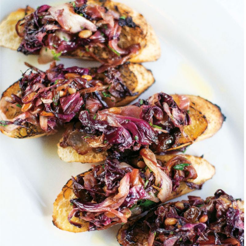 Heat the olive oil in a large skillet over medium-high heat. Add the onions and cook them, stirring occasionally for four to five minutes, until translucent. Add the radicchio and cook, stirring occasionally, for another six to eight minutes, or until the radicchio is wilted. Stir in the pine nuts, raisins, and vinegar. Reduce the heat to low and continue cooking the mixture for another 15 minutes, or until the vinegar has reduced by 75 percent. Add the parsley. Season with salt and pepper to taste and serve atop the grilled bread. The radicchio in saor can be served warm, at room temperature, or cold and can be refrigerated for up to a week.