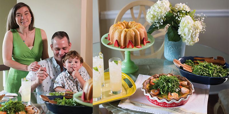 Combine the arugula and green parts of the onions in a serving bowl and toss with the dressing. Place on top of each wedge of quiche.