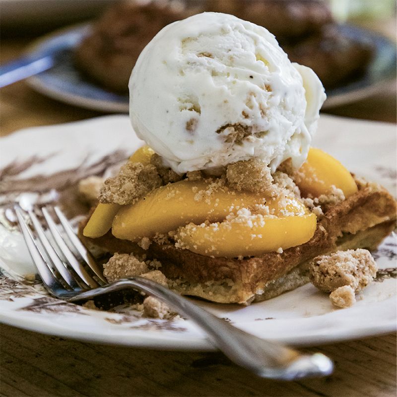 Place two waffles, one on top of the other, on a plate. Top with sliced peaches, drizzling their juices all over the waffles, then add a nice fat scoop of ice cream. Add extra brown butter crumble, if desired.