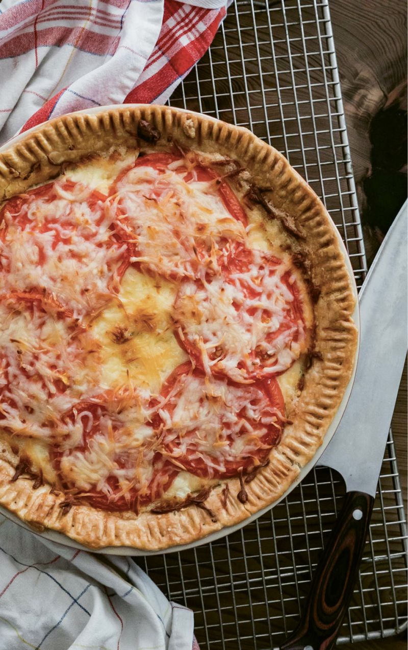 Place an even layer of sliced tomatoes in the bottom of the pie crust, then add a layer of chopped onion, followed by one of mozzarella. Lightly sprinkle with pepper and basil. Repeat until the layers fill up the inside wall of the pie crust (about three full series of layers). Spoon Parmesan-mayonnaise mixture on top of the final layer, spreading it so it completely covers the pie. Sprinkle shredded mozzarella on top.