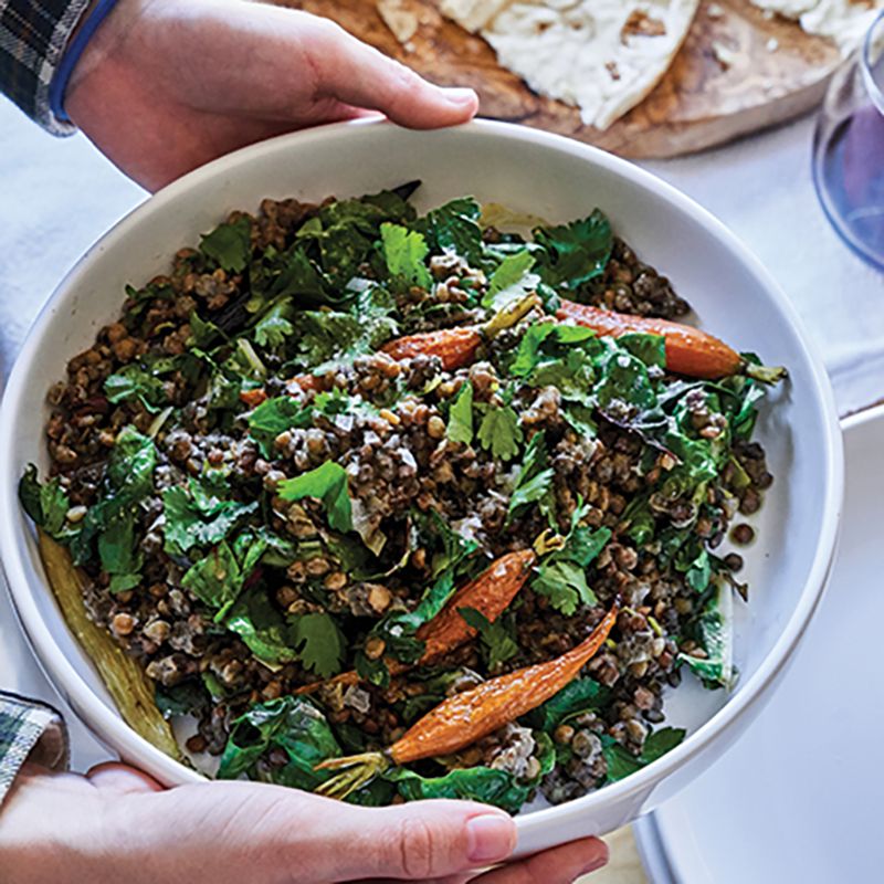 three to four minutes. Add rainbow chard and continue to sauté until the chard is just wilted. Add the cooked lentils, carrots, and herbs and coat with the vinaigrette.