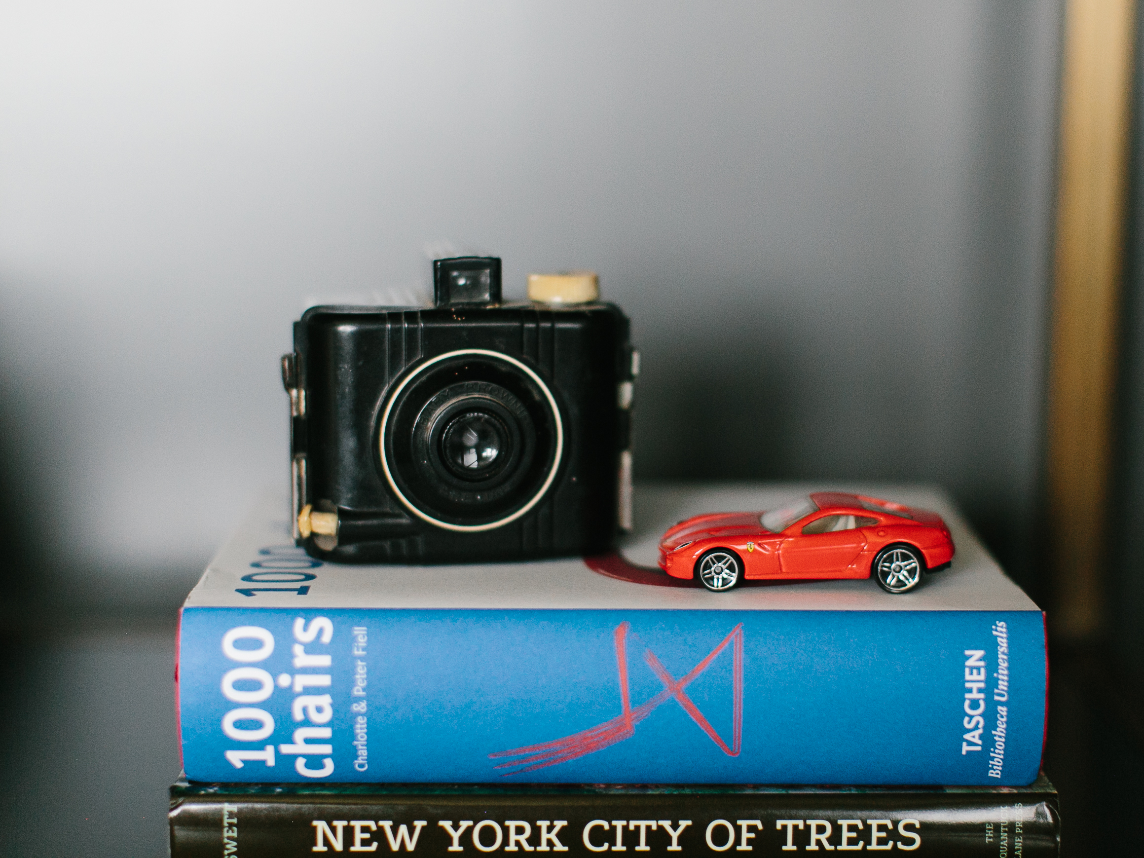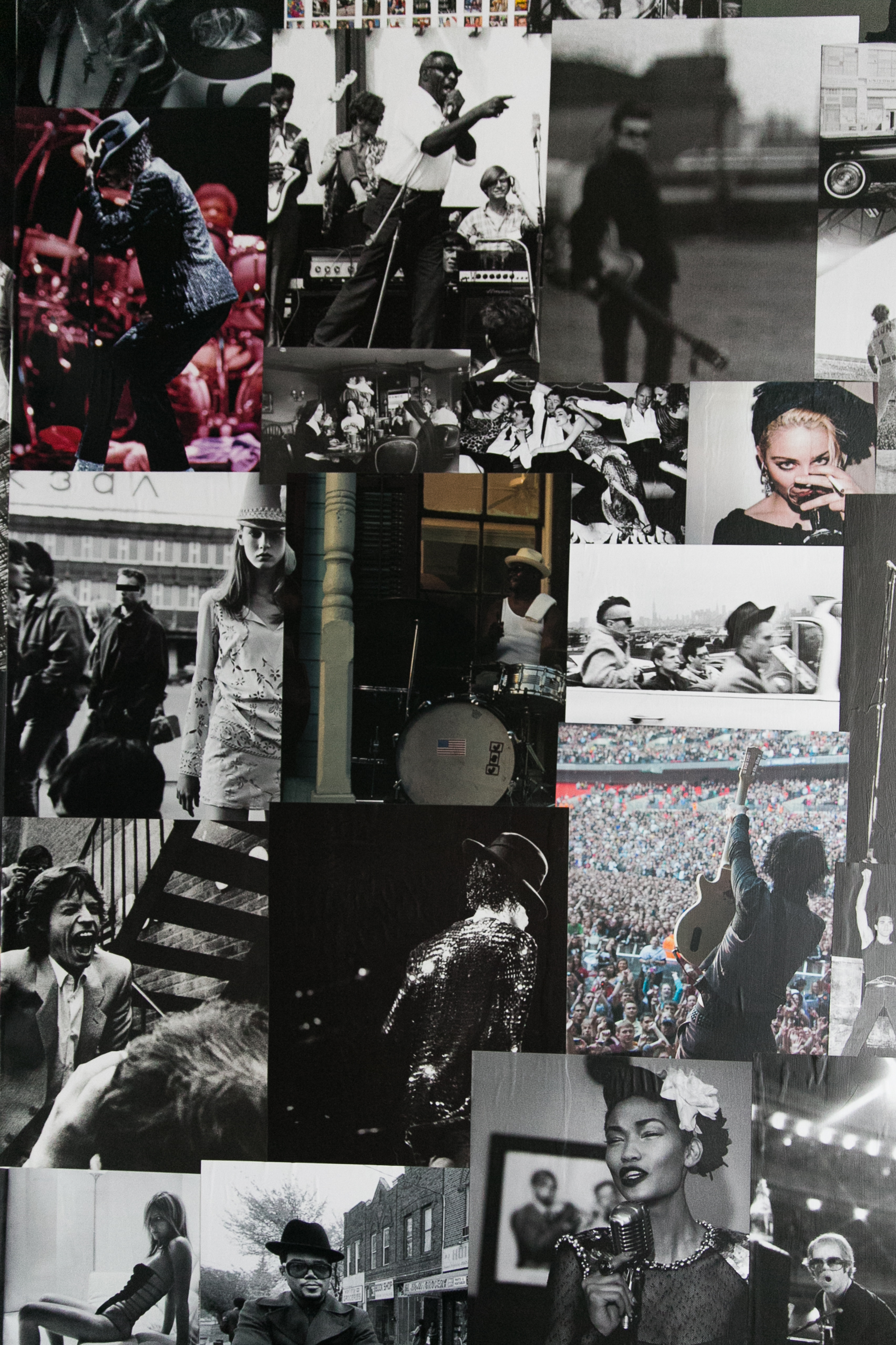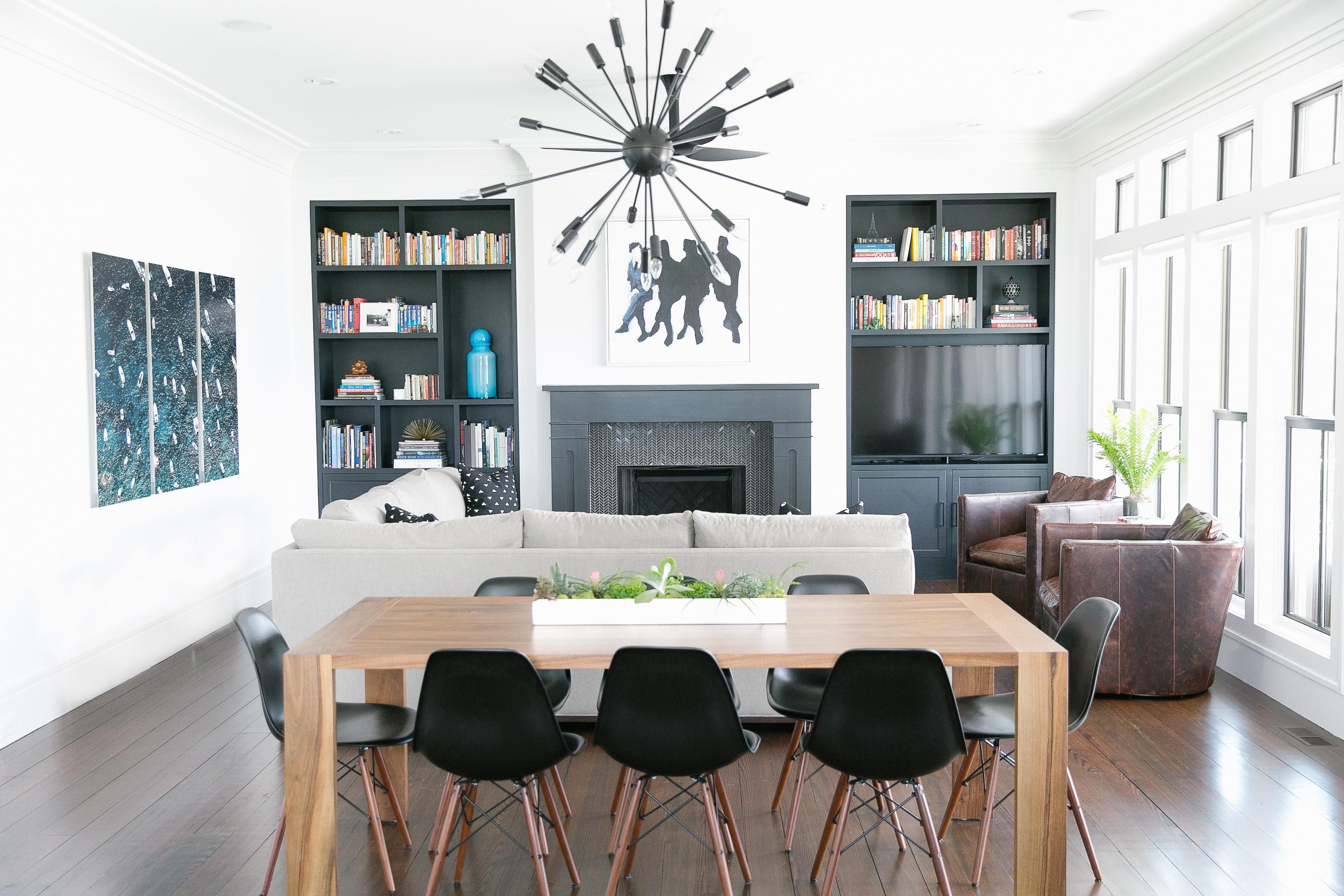To draw out this motif, she fused mid-century furnishings (“If you want to go retro, mid-century pieces have the cleanest lines,” she says) with picks that have an edgy feel, such as the Banksy-esque painting above the living-room mantel (“It looks like the dark side of corporate America,” she notes), the angular chandelier over the dining table, and the rock-and-roll wallpaper in the first-floor powder room. The wallpaper was a DIY job the couple tackled in one weekend, raiding coffee-table books for images of favorite musicians and gluing them to the wall. “Brad is obsessed with New Orleans jazz musicians, so they’re in there, and I grew up in the ’80s, so Madonna has a presence,” she says. Upstairs, a more intimate personal touch: in a hang space between the twins’ rooms, Melissa placed a grouping of skateboard decks that once belonged to her late brother. “He lived life to the fullest; I like these little reminders of him,” she says.