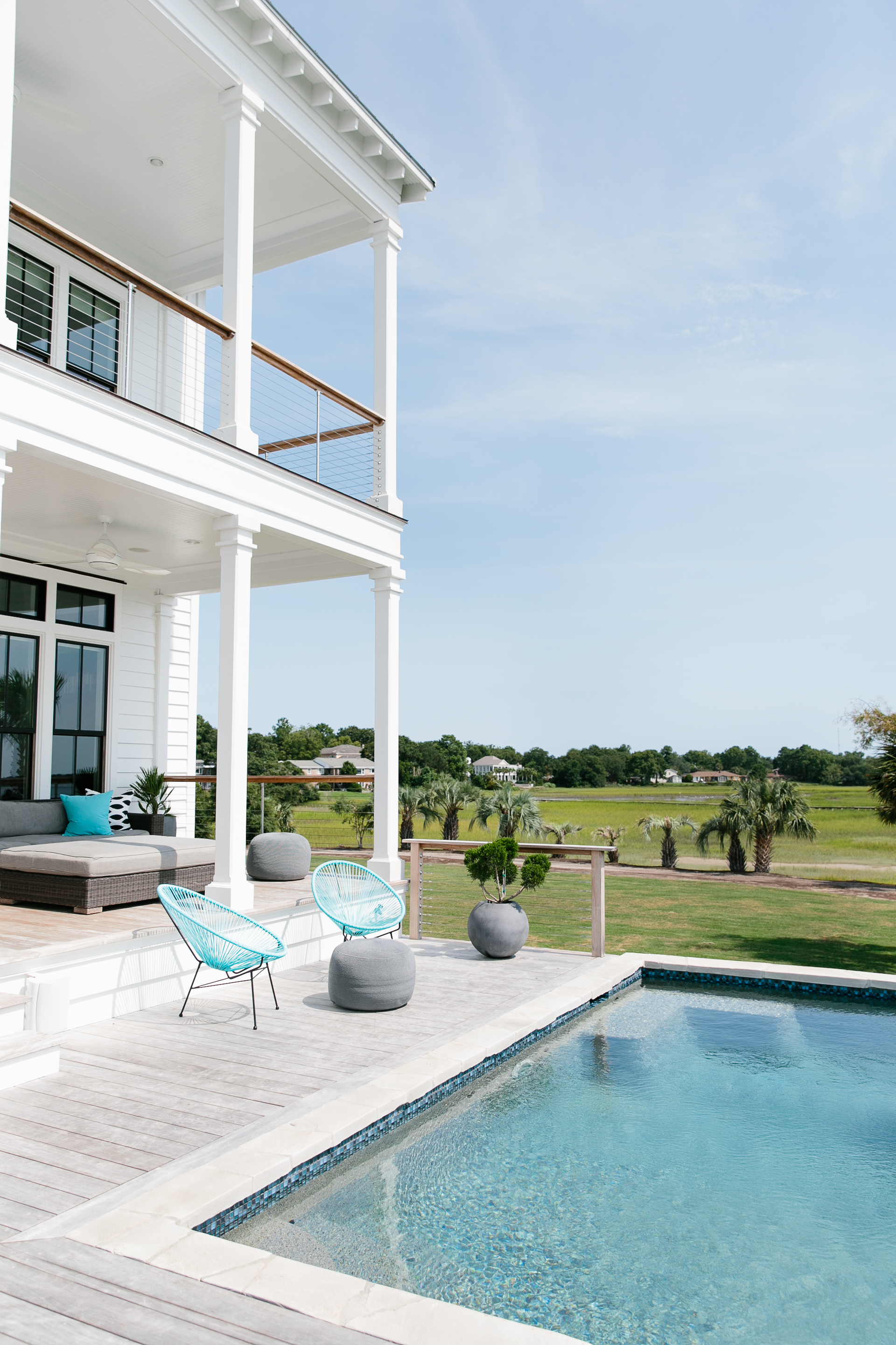 Walking through the entry hall of Melissa Lenox and Brad Davis’s Lowndes Pointe home is like fast-forwarding through a highlight reel of the couple’s history. Along the corridor, under a pitched beadboard ceiling, an artful grouping of framed photos hints at the whirlwind romance that swept them across the globe and landed them here, in a modern, coastal abode on the banks of the Ashley River. Their travels are well-documented: one scenic shot, taken by Brad during their first trip together, shows children playing in the street in Cartagena, Colombia. In another snap, the duo stands atop a glacier in snowy Patagonia, gloved hands intertwined and raised triumphantly in the air. Yet another features a graffiti-splashed wall that caught their eyes in Bologna, Italy. All lead to the end of the hall, where glass doors look out over a soothing tableau: palm trees sway in the breeze, the water ebbs and flows, and docked boats rise and fall with the tide.