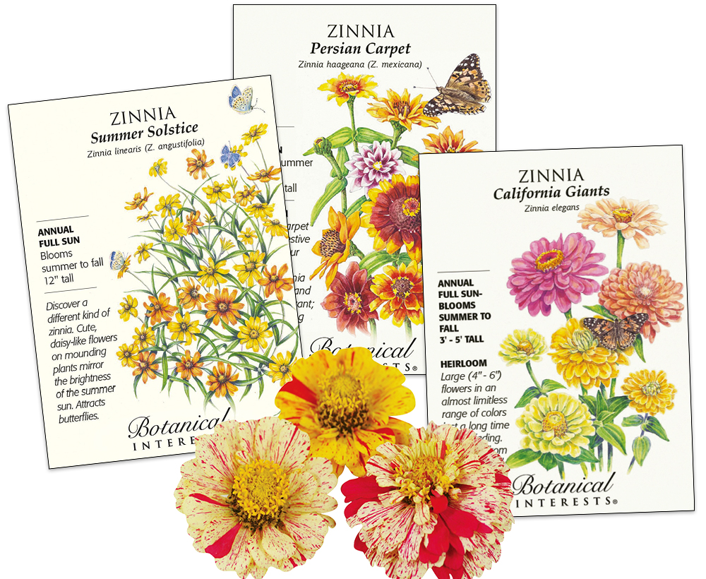 ‘Summer Solstice’ is a stand-out cultivar of Zinnia angustifolia, which shares a bushier growth habit with Zinnia haageana (try ’Persian Carpet’). The leggier Zinnia elegans is called “common zinnia,” yet cultivars like ‘California Giants’ and ‘Peppermint Stick’ (center) look uncommon indeed.