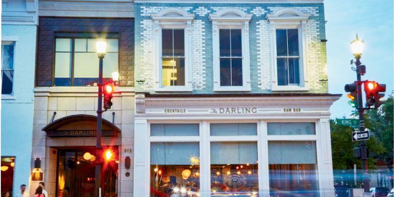 It’s tempting to linger outside the triple-paned façade of The Darling Oyster Bar, especially once the sun dips and the spacious seafood hall glows from within. A wide display case tempts passersby with oysters, lobster tails, shrimp, crab claws, and whole fish, all nestled in gleaming ice crystals and labeled with handwritten cards specifying from whence they came.